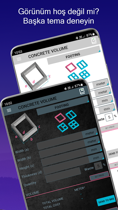 कंक्रीट कैलकुलेटर निम्नलिखित कार्यों के साथ एक निःशुल्क कैलकुलेटर है: