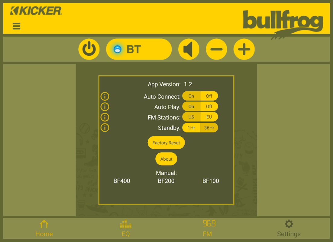 एक एप्लिकेशन को सभी किकर Bullfrog वक्ताओं के साथ काम करता है। कोई ज़रूरत नहीं है विभिन्न वक्ताओं के लिए अलग क्षुधा डाउनलोड करने के लिए।