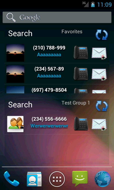 यह एक सरल विजेट है जो स्क्रॉल करने योग्य सूची के रूप में आपके फोन संपर्कों (सभी, पसंदीदा-तारांकित या व्हाट्सएप और Viber संपर्कों सहित कोई अन्य समूह) को दिखाता है। आप अपने किसी भी संपर्क को कॉल या एसएमएस भेज सकते हैं। व्हाट्सएप और वाइबर कॉन्टैक्ट्स के लिए आप कॉल या चैट शुरू कर सकते हैं।