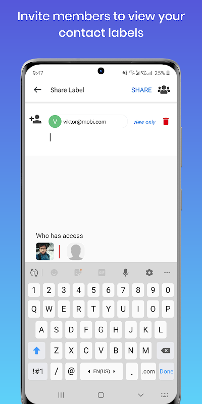हमने Gmail® के लिए साझा संपर्क इस तरह से बनाए हैं जो आपके लिए किसी भी Gmail™ और Google Workspace™ (G Suite) उपयोगकर्ताओं के साथ Google संपर्क साझा करना बेहद आसान बना सकते हैं। बस हमारा ऐप इंस्टॉल करें और अपने Google संपर्क लेबल साझा करना शुरू करें।