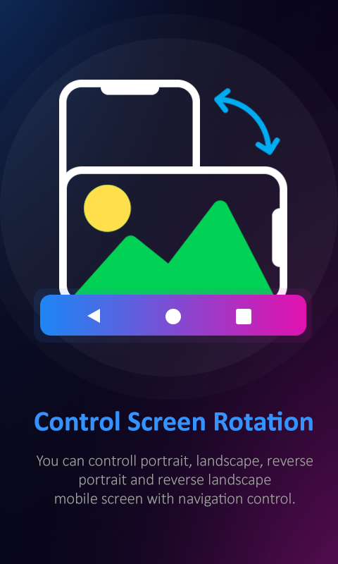 स्क्रीन नियंत्रक उपकरण जो नेविगेशन नियंत्रण के साथ स्क्रीन के ओरिएंटेशन और रोटेशन को बदल सकता है। स्क्रीन ओरिएंटेशन को नोटिफिकेशन बार से संशोधित किया जा सकता है। यह एक टूल एप्लिकेशन है जो प्रदर्शित एप्लिकेशन की विशेषताओं से स्वतंत्र रूप से स्क्रीन के ओरिएंटेशन और रोटेशन को संशोधित कर सकता है। अपने फ़ोन ओरिएंटेशन को डिफ़ॉल्ट करने के लिए अपनी स्क्रीन को घुमाएँ। यदि आपको अपने फ़ोन की स्क्रीन को अपनी पसंद के अनुसार घुमाने के लिए इसकी आवश्यकता है, तो आप स्क्रीन के घूर्णन को नियंत्रित करने के लिए इस ऐप का उपयोग और इंस्टॉल कर सकते हैं।