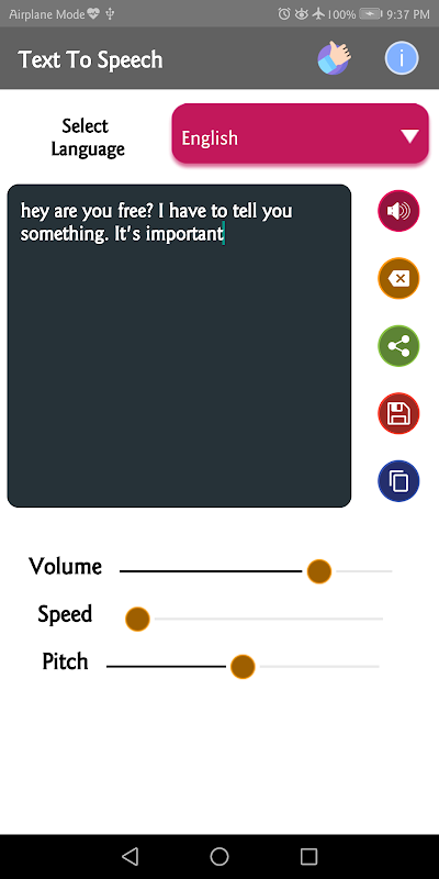 his/her specific text or paste on screen then tap on speaker button to convert it to voice and save it in device internal storage. It provides some other features as well