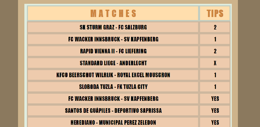 In our application you can find free match result tips, double chance predictions, over / under tips, both teams to score match tips.