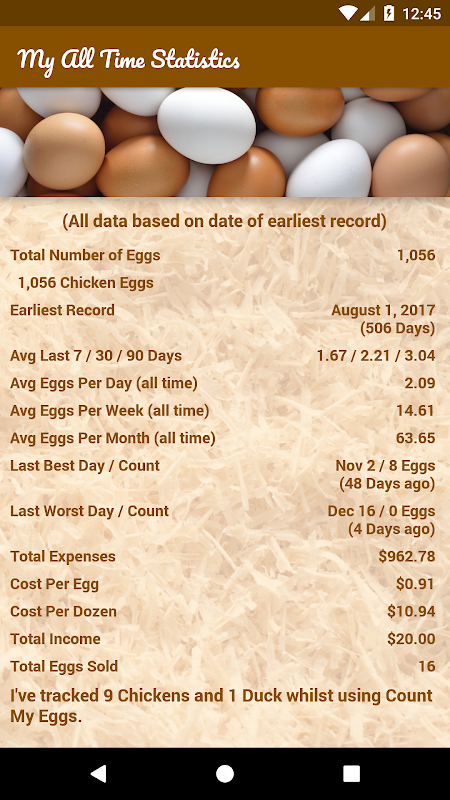 मेरे अंडे की गणना करें - अपने घर के खेत के अंडे के उत्पादन (मुर्गियां, बतख, गीज़, गिनी, तीतर, तुर्की और बटेर), खर्च, आय और कुक्कुट परिवर्तन पर नज़र रखें और समय के साथ इसे ग्राफ करें। पैदावार और लागत देखें और अपने पोल्ट्री और उनकी बिछाने की आदतों में अंतर्दृष्टि प्राप्त करें।