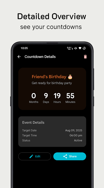• सहज निर्माण: सेकंडों में उलटी गिनती सेट करें, तारीखें, समय चुनें और अनुकूलित करें।