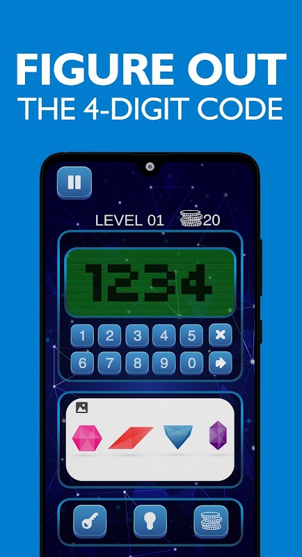प्रत्येक स्तर पर आपको एक अद्वितीय कुंजी की सहायता से चार अंकों के कोड का पता लगाने के लिए अपने अंतर्ज्ञान का उपयोग करने की आवश्यकता होगी। यह कुंजी एक छवि, पाठ या ऑडियो हो सकती है। क्या आप?