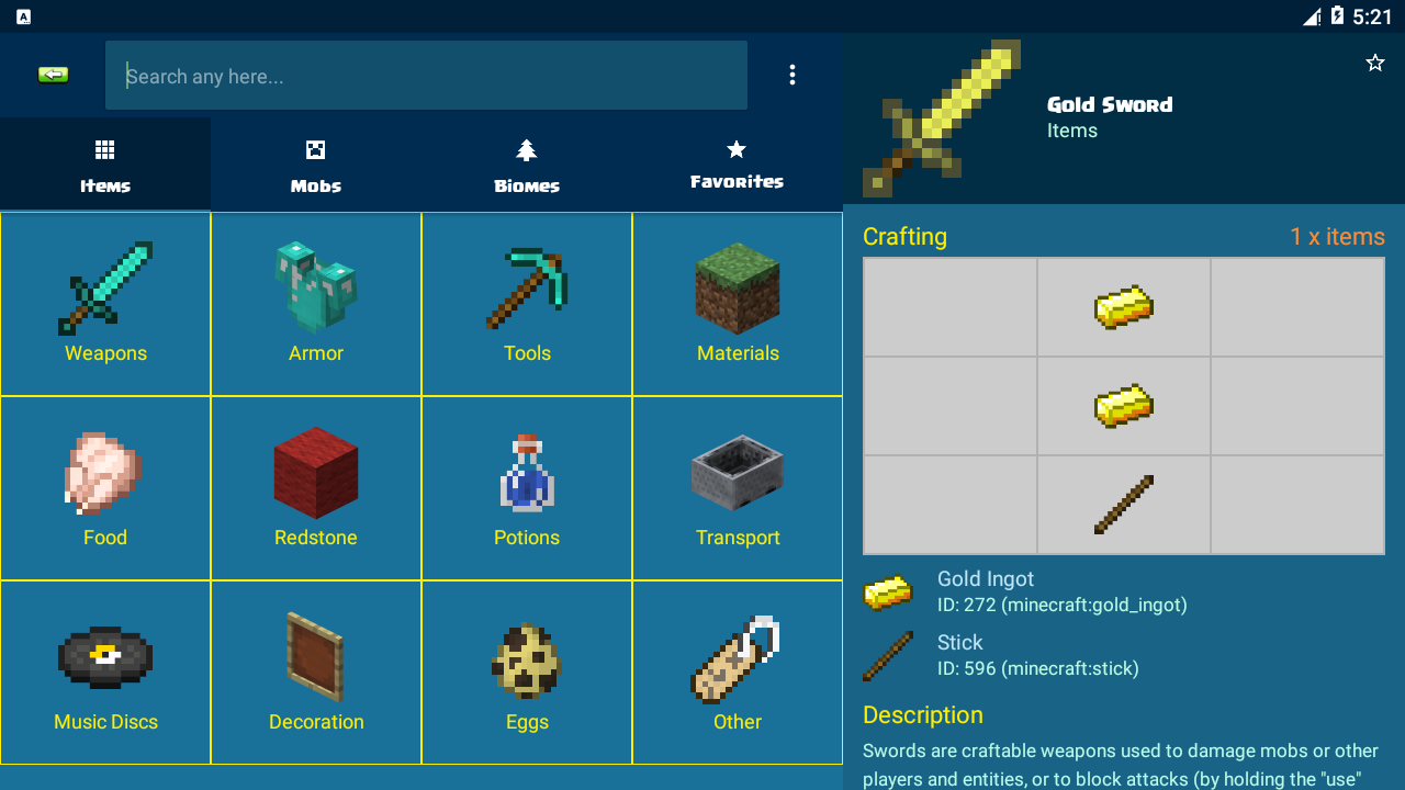 ** Crafting Guide for Minecraft - provides the recipes for crafting items in Minecraft. You can easily search through all of the items and even get the IDs of the items. This is a perfect companion app to Minecraft.