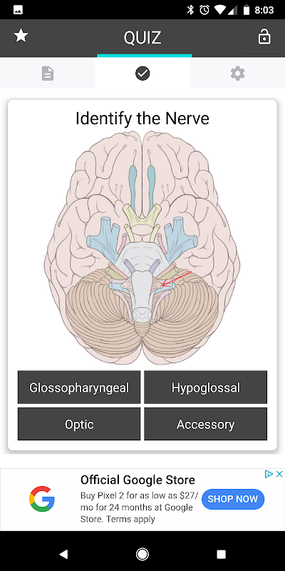 This is a flashcard application that contains basic information about the 12 cranial nerves. Take advantage of the best study technique by hiding/showing individual nerve characteristics. Test your knowledge on nerve identification with an endless quiz.