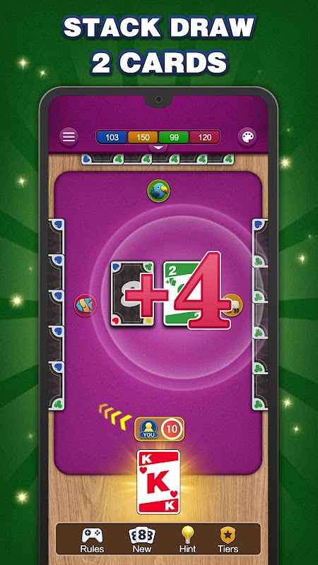 - खेल के मैदान को समतल करने के लिए वाइल्ड कार्ड का उपयोग करें या अगले खिलाड़ी के लिए दंड बढ़ाने के लिए पावर कार्ड का उपयोग करें।
