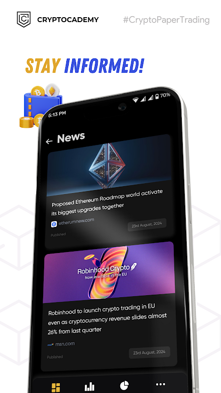 क्रिप्टोकैडेमी शैक्षिक संसाधन और रियल-टाइम ट्रेडिंग सिम्युलेटर देता है।