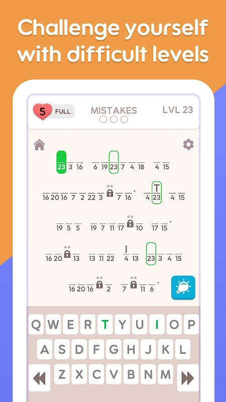 - चुनौतीपूर्ण पहेलियाँ: अनूठी क्रिप्टोग्राम पहेलियों के साथ अपने तर्क और अनुमान कौशल का परीक्षण करें।