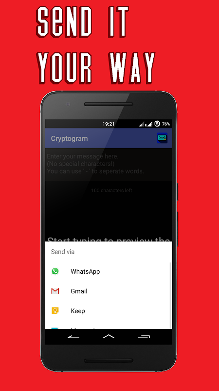 Cryptogram can help you chat in ciphers. So even if someone is sitting right next to you, they will have absolutely no idea as to what you are chatting. In other words, Cryptogram helps reinforce your privacy on virtually any app that exists.