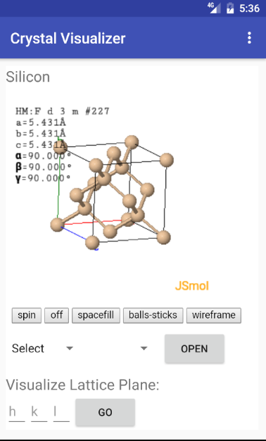 The app can show space-filling, balls&sticks, and wireframes representations of the crystal structures.