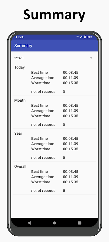 एप्लिकेशन मैजिक क्यूब्स 2x2x2, 3x3x3 और अन्य मैजिक क्यूब्स आदि के पूरा होने का समय रिकॉर्ड करता है।