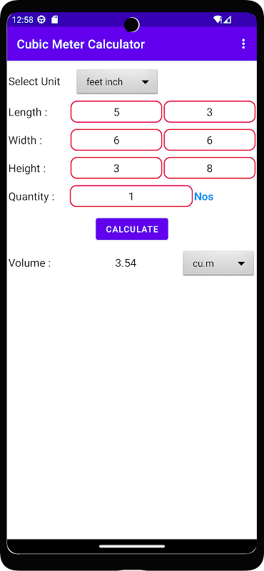 इस ऐप का उपयोग दी गई लंबाई, चौड़ाई, ऊंचाई के लिए क्यूबिक मीटर वॉल्यूम की गणना करने के लिए किया जाता है। आप लंबाई, चौड़ाई और ऊंचाई को अलग-अलग इकाइयों जैसे मीटर, फीट, इंच, मिमी, सेमी, यार्ड आदि में दर्ज कर सकते हैं और उत्तर आपको क्यूबिक मीटर, क्यूबिक फुट, क्यूबिक यार्ड आदि में मिलेगा।
