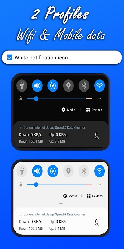 - (वाईफ़ाई और मोबाइल डेटा) के लिए दो अलग-अलग प्रोफाइल के साथ (वाईफाई और मोबाइल डेटा) डेटा उपयोग और वर्तमान इंटरनेट उपयोग की गति की सूचना दिखाना।