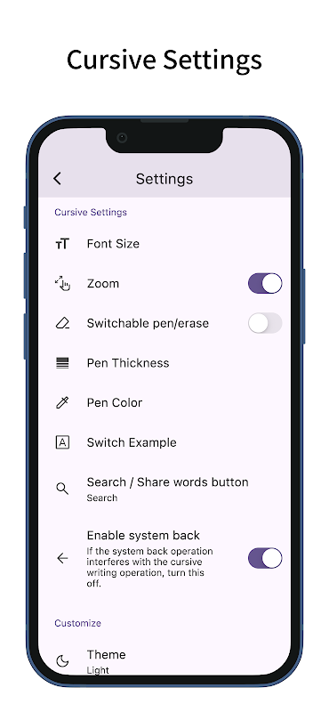 यह ऐप आपको ट्रेसिंग द्वारा कर्सिव का अभ्यास करने देता है।