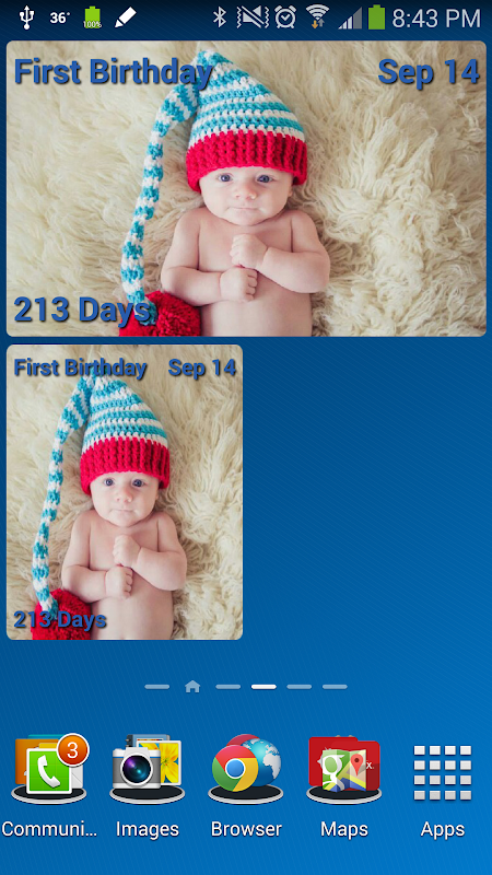 Widget that counts down to a special date such as anniversary, birthday, graduation, wedding, tv show, movie, special event, etc. You set a custom background from a picture on your device and can resize the size of the widget. There are many other options you can set.