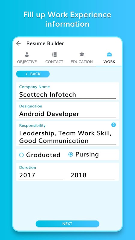 हमारा ऐप सभी स्तरों के जॉब चाहने वालों की मदद करने के लिए डिज़ाइन किया गया है - एंट्री-लेवल उम्मीदवारों से लेकर अनुभवी दिग्गजों तक। 8+ से ज़्यादा प्रोफेशनल रिज्यूमे टेम्प्लेट के साथ, हमारा रिज्यूमे मेकर आपको कस्टमाइज़्ड रिज्यूमे बनाने में मदद करता है जो आपके कौशल, शिक्षा और उपलब्धियों को उजागर करते हैं।
