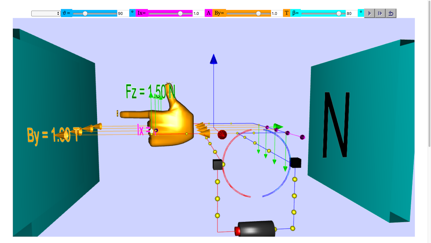 The key to producing motion is positioning the electromagnet within the magnetic field of the permanent magnet (its field runs from its north to south poles). The armature experiences a force described by the left hand rule. This interplay of magnetic fields and moving charged particles (the electrons in the current) results in the magnetic force (depicted by the green arrows) that makes the armature spin because of the torque. Use the slider current I to see what happens when the flow of current is reversed. The checkbox current flow & electron flow alows different visualization since I = d(Q)/dt and Q= number of charge*e. The Play & Pause button allows freezing the 3D view for visualizing these forces, for checking for consistency with the left hand rule .