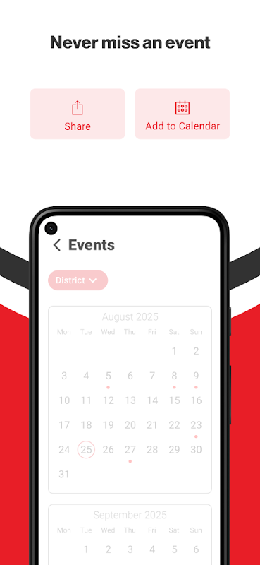 घटना अनुभाग जिले भर में घटनाओं की एक सूची दिखाता है। उपयोगकर्ता अपने कैलेंडर में एक ईवेंट जोड़ सकते हैं और एक टैप से उस ईवेंट को दोस्तों और परिवार के साथ साझा कर सकते हैं।