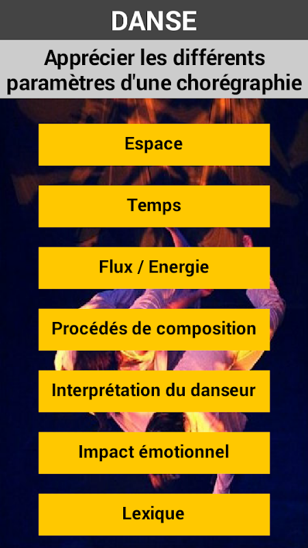 इस एप्लिकेशन के छात्रों, कोरियोग्राफी पढ़ नृत्यकला तत्वों की पहचान करने और एक प्रासंगिक व्यक्तिगत निर्णय व्यक्त करने के लिए सीखने में मदद करना है।
