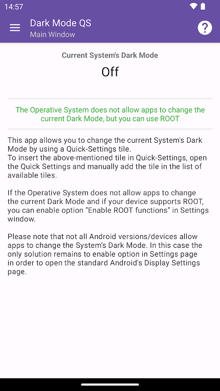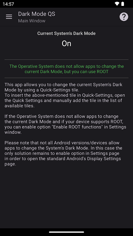 यह ऐप आपको क्विक-सेटिंग्स टाइल का उपयोग करके वर्तमान सिस्टम के डार्क मोड को बदलने की अनुमति देता है।