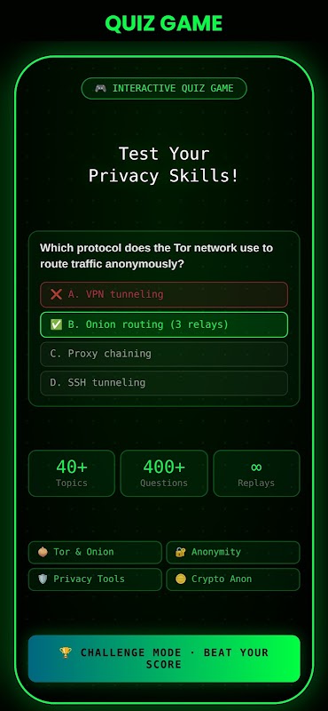 🚀 डार्क वेब को सुरक्षित रूप से एक्सप्लोर करें। ऑनलाइन गोपनीयता में महारत हासिल करें। साइबर सुरक्षा क्विज़ खेलें।