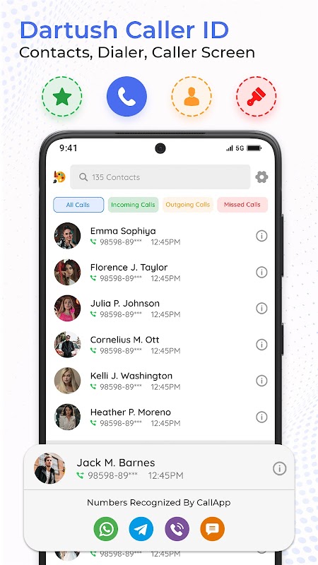 डार्टश इनकमिंग और आउटगोइंग कॉल के लिए एक कस्टम स्टाइल स्क्रीन प्रदान करता है, और अद्भुत कॉल थीम, कॉलर आईडी, उच्च गुणवत्ता वाला अनुभव और अन्य व्यक्तिगत फोन सेटिंग्स प्रदान करता है।
