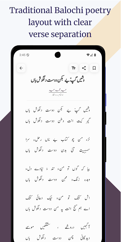• सुंदर टाइपोग्राफी और आरटीएल समर्थन के साथ बालोची कविता पढ़ें