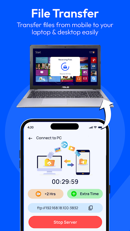 बिना कंप्यूटर की ज़रूरत के, वाई-फ़ाई नेटवर्क के ज़रिए एक फ़ोन से दूसरे फ़ोन में डेटा ट्रांसफ़र और फ़ाइल शेयरिंग।