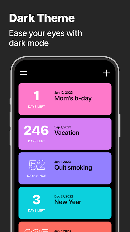 We've also given the app a fresh new look, including a redesigned home screen and a new app icon. Plus, we've added a variety of new templates to inspire you to count the days until your most important life events, such as birthdays, anniversaries, weddings, and new births.
