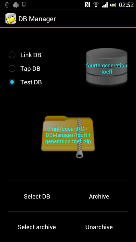 DB Manager archives and un-archives databases of these Causal Idea apps : LinKad, TapKad, Attendance, Notification, Test and Grade. It facilitates database sharing among Android devices running the apps.