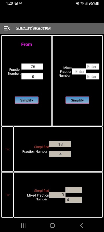 - हमारी टीम ने दशमलव, अंश और मिश्रित अंश संख्या के बीच परिवर्तित करने के लिए एक सरल और दक्षता आवेदन विकसित किया। सामान्य तौर पर, अंश, मिश्रित अंश से दशमलव में परिवर्तित करना आसान है, लेकिन पुनरावृत्ति करने के लिए दशमलव को दोहराने के कारण रूपांतरण अधिक जटिल है। हमारा एल्गोरिथ्म आवर्ती दशमलव को ठीक उसी अंश तक पुनर्प्राप्त कर सकता है यदि दशमलव को दोहराने का अंश 6 संख्या से अधिक हो। अधिक मैनुअल जानकारी के लिए कृपया नीचे दिए गए उदाहरण देखें।