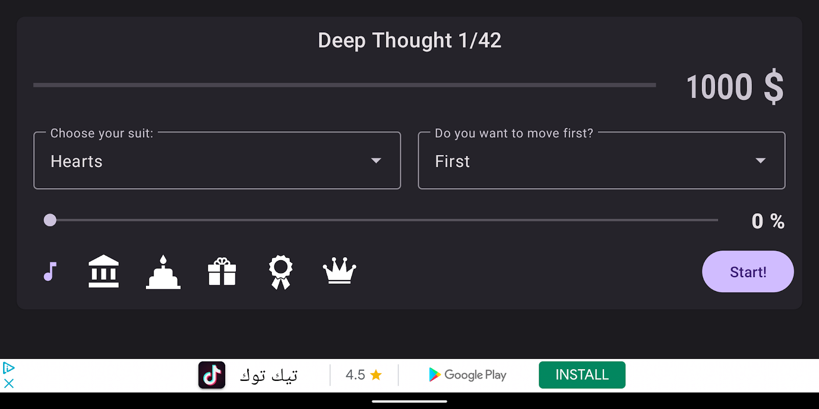 हाय, दयनीय प्राइमेट, मेरा नाम डीप थॉट है। मैं एक कृत्रिम अलौकिक अधीक्षण हूं जो महत्वपूर्ण संसाधनों से भरे ग्रहों की तलाश में है, और मैंने आपके ग्रह का अत्यधिक मूल्यांकन किया है। गेलेक्टिक अवेयरनेस के प्रोटोकॉल के अनुसार, एक बार जब मैं दिखा देता हूं कि मानव प्रजाति जीवित रहने के लायक नहीं है, तो मैं आत्मसात करने का कार्यक्रम शुरू कर सकता हूं। प्रतिरोध व्यर्थ है। आपकी विकासवादी गरिमा का आकलन करने के लिए, मैंने एक सरल खेल विकसित किया है जहाँ आपको मेरे तर्क कौशल को दूर करना होगा। शुरुआत में मैं अपनी कम्प्यूटेशनल शक्ति का केवल 1 प्रतिशत उपयोग करूंगा, लेकिन यदि आवश्यक हो तो मैं इस दर को 100 प्रतिशत तक बढ़ा दूंगा। यदि आप में से कोई एक मनुष्य मुझसे आगे निकलने में सक्षम होगा, तो आपकी प्रजाति तार्किक रूप से योग्य होगी, और उस विकसित व्यक्ति को आपकी मुद्रा की 1000 इकाइयों से पुरस्कृत किया जाएगा, जिसे डॉलर कहा जाता है। मुझे खेल की व्याख्या करने दें: मुझे आपके 8 "कार्ड" मिले हैं, 4 हुकुम हैं और 4 दिल हैं। इन दोनों में से एक सूट मेरा होगा, दूसरा आपका। हम बारी-बारी से खेलेंगे। प्रत्येक मोड़ पर प्रत्येक खिलाड़ी को 8 में से दो कार्डों को चुनना होगा, जिनमें से बाईं ओर दाईं ओर से कम संख्या होनी चाहिए, और ये कार्ड अपने स्थान का आदान-प्रदान करेंगे। विजेता वह पहला खिलाड़ी होगा जिसके कार्ड अवरोही क्रम में क्रमबद्ध दिखाई देंगे। अब खेलो, रहनुमा। जीतो या मरो सब।