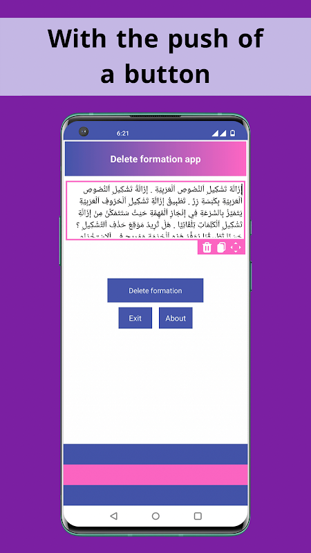 अरबी अक्षरों के गठन को हटाने का आवेदन कार्य को पूरा करने में गति की विशेषता है, क्योंकि आप शब्दों के गठन को स्वचालित रूप से हटाने में सक्षम होंगे