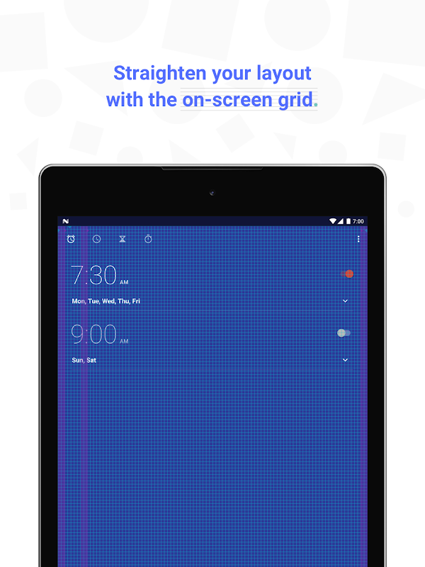 ग्रिड ओवरले - जल्दी टॉगल परदे पर ग्रिड असंगत रिक्ति या गलत गठबंधन तत्वों के लिए लेआउट जाँच करें। आप भी ग्रिड आकार और रेखा रंग अनुकूलित कर सकते हैं।
