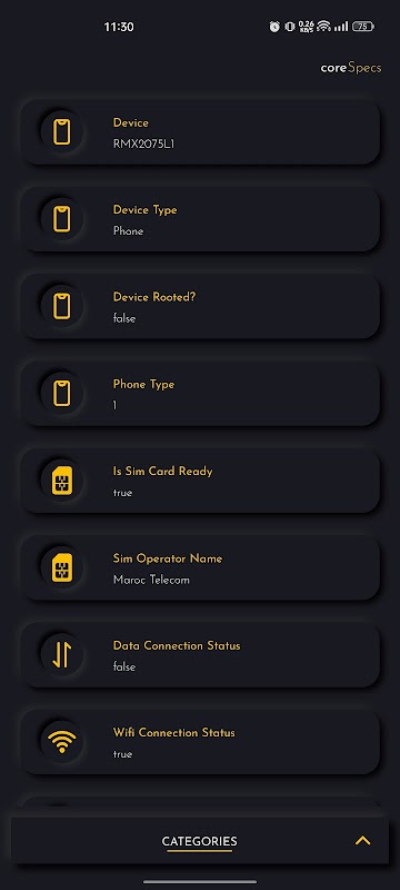 आपके फ़ोन की विभिन्न विस्तृत जानकारी नीचे दी गई है: