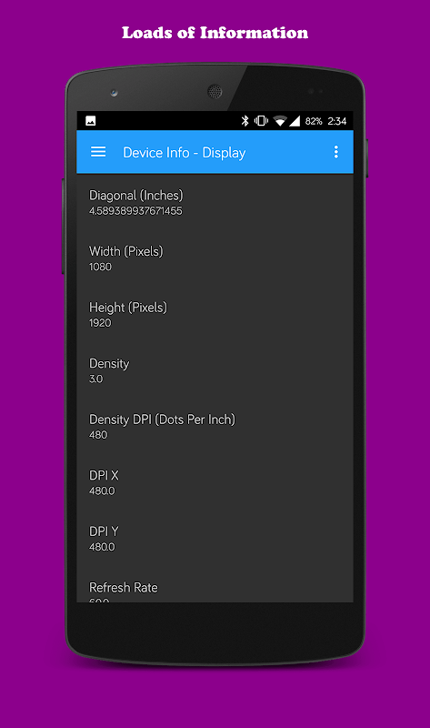 - Display Information (Screen Size in Inches or Pixels, Density, Refresh Rate, etc.)