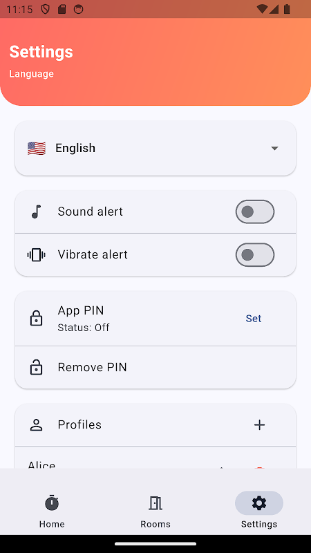 डिवाइस का समय नियंत्रित करें: प्रारंभ/रोकें, त्वरित जोड़ें, कमरे, प्रोफाइल और रिपोर्ट।