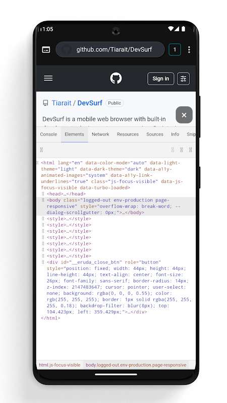 चाहे आप फ्रंट-एंड डेवलपर हों, वेब डिज़ाइनर हों, या सिर्फ यह जानने के इच्छुक हों कि वेबसाइटें कैसे काम करती हैं, DevSurf एक पूर्ण डेस्कटॉप ब्राउज़र की शक्ति को सीधे आपके मोबाइल डिवाइस पर लाता है।