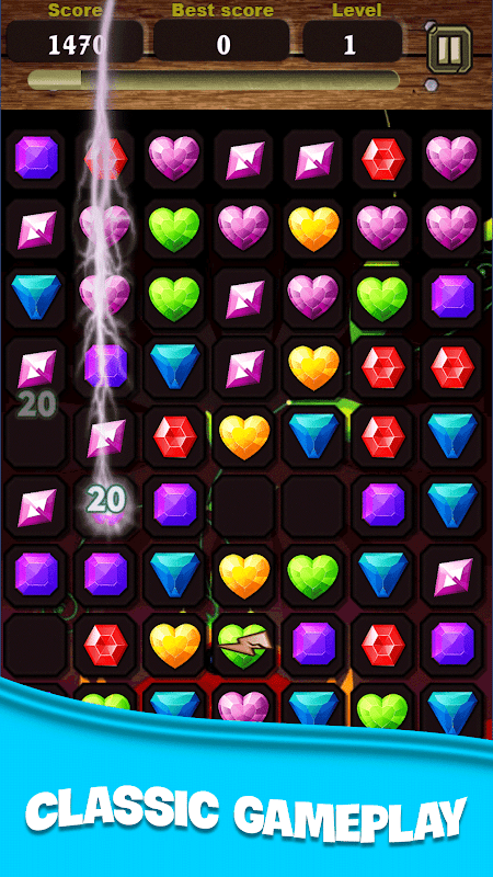 इस क्लासिक डायमंड मैचिंग गेम मोड में कठिनाई बढ़ने पर स्तरों के माध्यम से मार्च करें। दैनिक तनाव को दूर करें और आरामदेह संगीत, बिना किसी समय सीमा और संकेतों के साथ अपनी गति से खेलें, या अपने स्वयं के उच्च स्कोर को हराने का प्रयास करें!