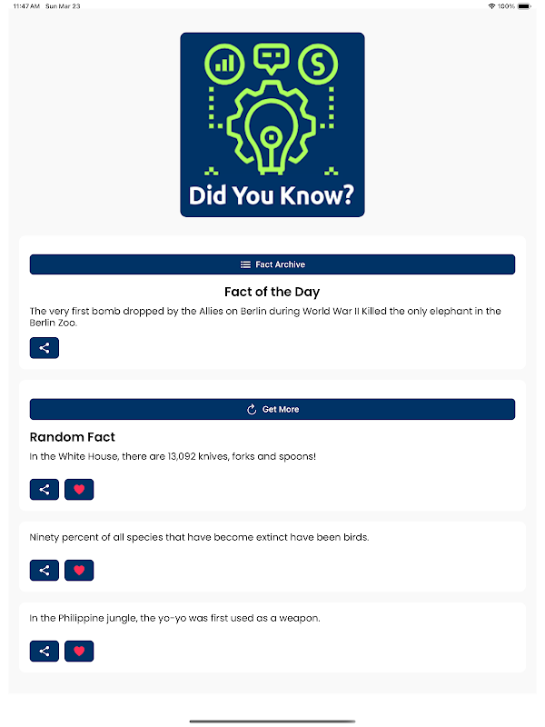 Fuel your curiosity with daily and random facts that surprise, entertain, and educate! Whether you're a trivia lover, lifelong learner, or just like to impress your friends, Did You Know? delivers bite-sized knowledge right to your fingertips.