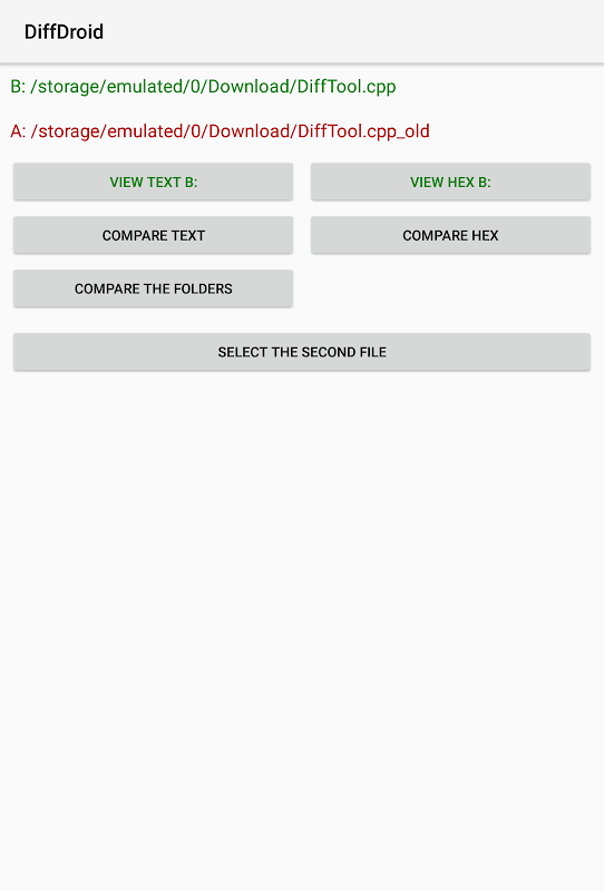 - by using that APP, you can start DiffTool from any File Explorer (simply select DiffDroid when you open a file from your Explorer; then press "Select the Second File" to add file B: in the same way).