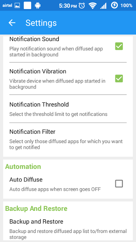 अब डिफ्यूज़र के साथ, आप उन ऐप्स पर नज़र रख सकते हैं और उन सूचनाओं को प्राप्त कर सकते हैं जब उन मेमोरी और बैटरी लेने वाले ऐप्स बैकग्राउंड में चलने लगते हैं। डिफ्यूज़र आपके डिवाइस को तेज़, स्मूथ बनाने और बैटरी लाइफ को बेहतर बनाने के लिए उन ऐप्स को फैलाने में मदद करता है।