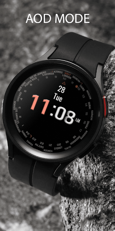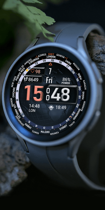 यह घड़ी बाहरी रिंग पर विश्व समय क्षेत्र प्रदर्शित करती है और 2 अनुकूलन योग्य जटिलताएँ प्रदान करती है। इसे उपयोगकर्ताओं को विश्व समय क्षेत्रों का अवलोकन करने की सुविधा प्रदान करने के लिए डिज़ाइन किया गया है।