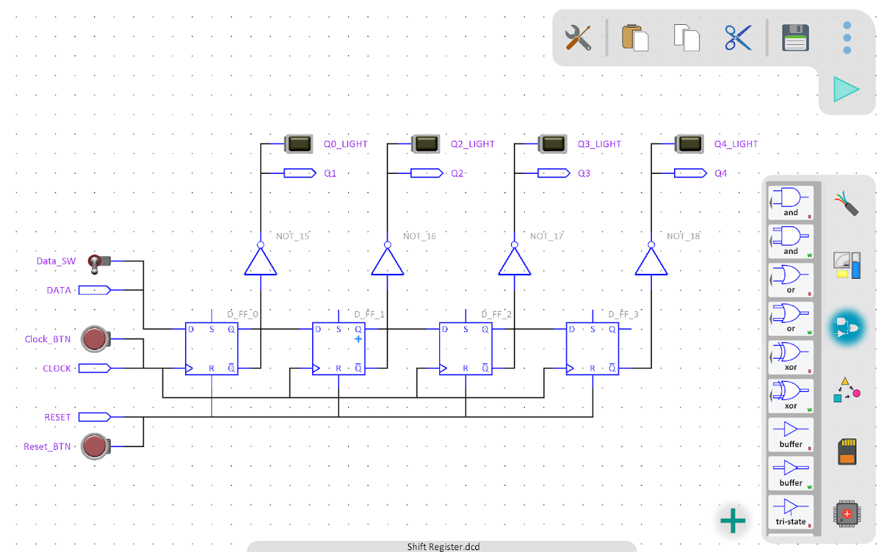 डिजिटल सर्किट सिम्युलेटर विभिन्न घटकों जैसे लॉजिक गेट्स, काउंटर, डिकोडर, फ्लिप-फ्लॉप, और बहुत कुछ का उपयोग करके बुनियादी से जटिल डिजिटल सर्किट के निर्माण में मदद करता है।