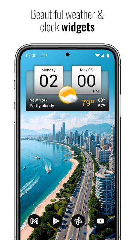 एप्लिकेशन कई अलग-अलग खाल के साथ 4x2 विजेट का समर्थन करता है। विजेट वर्तमान मौसम (आइकन, स्थिति और तापमान), समय और दिनांक और अगला अलार्म प्रदर्शित कर सकते हैं। विजेट हॉटस्पॉट का भी समर्थन करते हैं जिनका उपयोग आप उपयोगी ऐप्स लॉन्च करने के लिए कर सकते हैं। ऐप अतिरिक्त विजेट खाल का भी समर्थन करता है जिसे वैकल्पिक रूप से डाउनलोड किया जा सकता है।