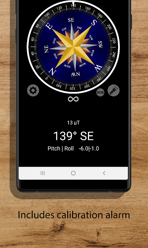 इस एप्लिकेशन ने चुंबकीय क्षेत्र और एक्सेलेरोमीटर सेंसर का उपयोग करके उपयोगकर्ता को चुंबकीय हेडिंग दिखाई। उपयोगकर्ता को सही ओरिएंटेशन पाने के लिए स्मार्टफोन को पर्याप्त रूप से सेट करने के लिए पिच और रोल पैरामीटर भी दिखाया गया। जब स्मार्टफोन क्षैतिज स्थिति में होता है तो यह पैरामीटर हरे रंग में बदल जाता है और स्क्रीन के नीचे प्रदर्शित होता है। ओरिएंटेशन सिम्युलेटेड एनालॉग कंपास प्रदर्शित होता है। इसके अतिरिक्त ऐप में एक फ्लैशलाइट फ़ंक्शन है, जिसे एसओएस सिग्नल भेजने के लिए कॉन्फ़िगर किया जा सकता है। कंपास के सही ढंग से काम करने के लिए, आपके डिवाइस में एक्सेलेरोमीटर और जायरोस्कोप सेंसर होने चाहिए।