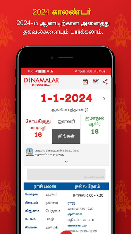 "दिनमला तमिल कैलेंडर 2026" में निम्नलिखित दो दृश्य हैं और यह दोनों दृश्यों के बीच सहज नेविगेशन को सक्षम बनाता है।